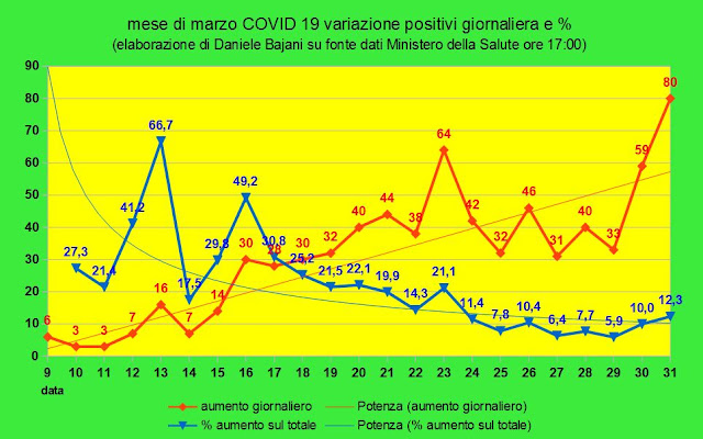 A volte può risultare un poco complicato leggere un grafico ma con una piccola spiegazione tutto diventa più facile. Prendiamo come esempio questo grafico che ci indica l'andamento di marzo nella variazione dei positivi a Cuneo. Se ogni positivo dei 591 totali del 29 marzo avesse infettato una persona, il 30 avremmo avuto una variazione di 591 positivi in più che corrisponderebbe ad un aumento del 100%. Vedendo invece che la variazione è stata di soli 59, vuole dire che c'è stato un aumento solo del 10% (non poco comunque). Quindi, guardando la linea blu ed i suoi valori, si può capire se l'andamento stia migliorando o no. Un'altra cosa che si può notare prendendo in considerazione le date 10 e 11 marzo o il 19 e il 25 è che, a fronte di numeri uguali di positivi aumentati in due giorni diversi, la variazione può risultare in ascesa o in calo e questo è dovuto al fatto che i due 3 e i due 32 sono in relazione con totali diversi. Quindi la linea blu fa in modo che non ci traggano in inganno valori apparentemente uguali.